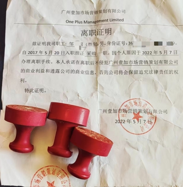 邹某国所私刻公章及自行制作的离职证明文件