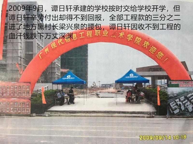 2010年,梁兴泉利用权势组织围标本村(吉山村委会)出资兴建的广州现代信息学院2.02亿项目工程,以广东金辉华公司中标,中标价是每平方米建筑面积为1725.7元,以1060元每平方米转包给河源公司和谭日轩施工(见附件)。第一期工程完工后,梁兴泉组织黑恶势力手段从该工程结算1.59亿工程款中强行抽取8529万元工程款,并以黑恶势力勒索和欺压施工队伍,至今不肯与施工队伍对账,梁兴泉组织黑恶势力强行克扣谭日轩5000多万元工程款和利息。