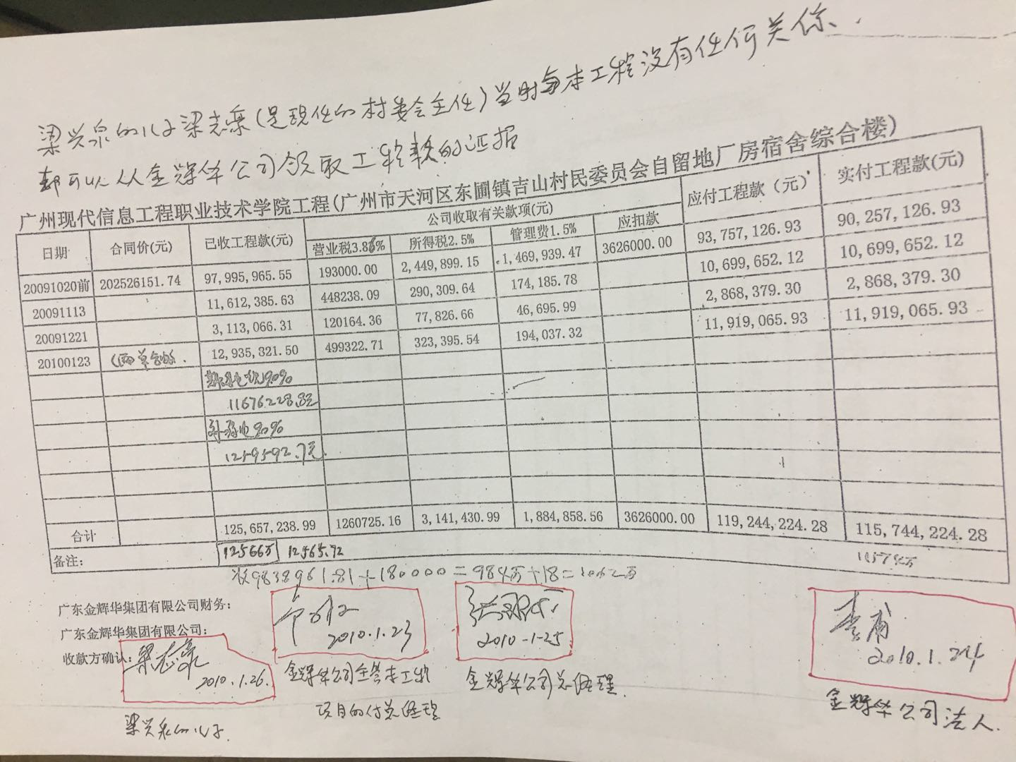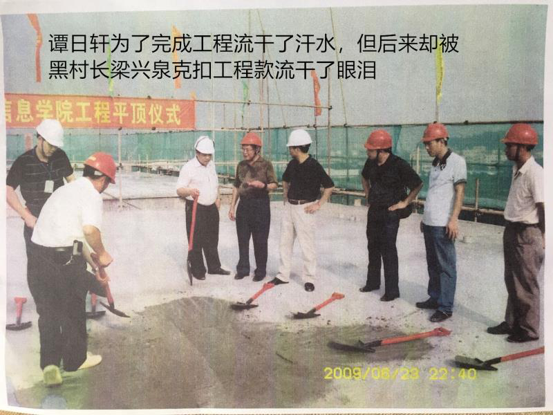 五,施工方按图纸施工完成学院东西两个设备房结算款为648万元,梁兴泉按建筑面积以1060元平方结算只支付给施工队105.3万元,从中强占621.2万元。(见附件资料) 以上5项,梁兴泉就从结算工程款中强占约8000万元。 2011年8 月25日,梁兴泉与施工方在业主吉山村委会和监理公司的黄广锐经理主持下,双方确定了施工方的应收款为9927万元(按双方约定应收11183.4万元,已被梁兴泉从中强行克扣了1156.6万元)。 梁兴泉贪心不足,开完结算会后即全部否认,对在公众面前确认的金额竟不肯兑现,而且组织黑恶势力手段从中强行克扣勒索施工队1125万元。 具体如下: