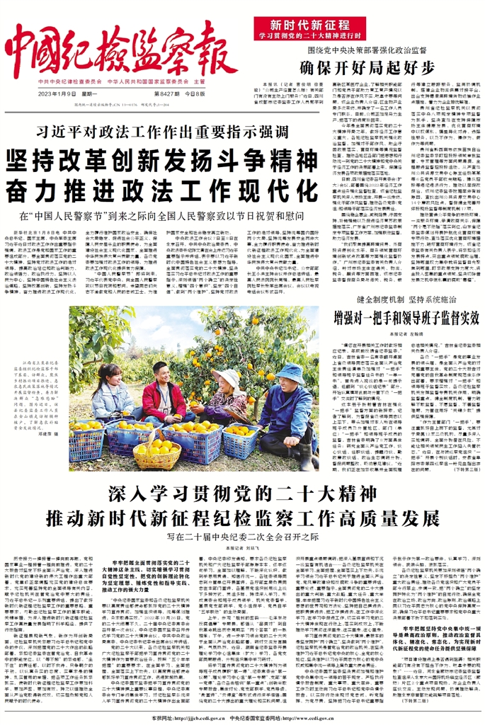 新华社北京1月8日电 中共中央总书记、国家主席、中央军委主席习近平近日对政法工作作出重要指示强调,政法工作是党和国家工作的重要组成部分。要全面贯彻落实党的二十大精神,坚持党对政法工作的绝对领导,提高政治站位和政治判断力、政治领悟力、政治执行力,坚持以人民为中心,坚持中国特色社会主义法治道路,坚持改革创新,坚持发扬斗争精神,奋力推进政法工作现代化,全力履行维护国家政治安全、确保社会大局稳定、促进社会公平正义、保障人民安居乐业的职责使命,为全面建设社会主义现代化国家、全面推进中华民族伟大复兴贡献力量。各级党委要加强对政法工作的领导,为推进政法工作现代化提供有力保障。 “中国人民警察节”即将到来,习近平代表党中央,向全国人民警察致以节日祝贺和慰问,希望同志们矢志不渝做党和人民的忠诚卫士,为维护国家安全和社会稳定再立新功。 中央政法工作会议7日至8日在北京召开。中共中央政治局委员、中央政法委书记陈文清在会上传达习近平重要指示并讲话,表示要以习近平新时代中国特色社会主义思想为指导,全面贯彻落实党的二十大精神,坚决落实习近平总书记对政法工作的重要指示,深刻领悟“两个确立”的决定性意义,增强“四个意识”、坚定“四个自信”、做到“两个维护”,坚持党对政法工作的绝对领导,坚持统筹国内国际两个大局,坚持统筹发展安全两件大事,全力履行职责使命,奋力推进新时代新征程政法工作现代化,为全面建设社会主义现代化国家、全面推进中华民族伟大复兴贡献力量。 中共中央书记处书记、公安部部长王小洪主持会议并作总结讲话。最高人民法院院长周强、最高人民检察院检察长张军出席会议。会议以电视电话会议形式召开。
